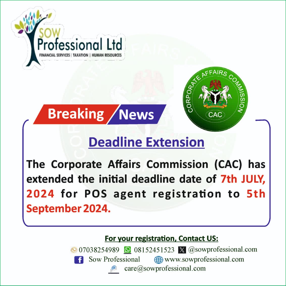 The Corporate Affairs Commission wishes to notify Fintech Operators also known as Point of Sales (POS) Operators that the initial deadline of 7th July, 2024 given for the registration of sole Agents, Super Agents and Agents has been extended for a period of sixty days beginning from 7th July, 2024 to the 5th September