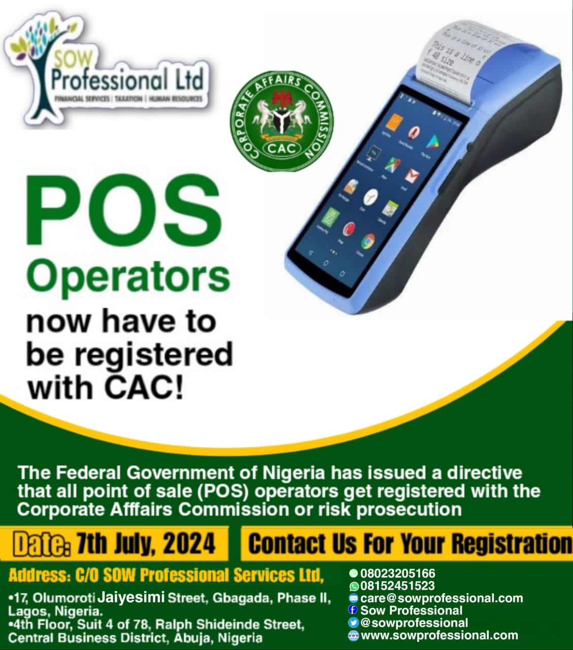 This directive has made it mandatory for POS terminals, whether as agents, merchants, or individuals to register with the Corporate Affairs Commission before the commencement of business, while those that already commenced business were given 7th July 2024 as the deadline to register same.